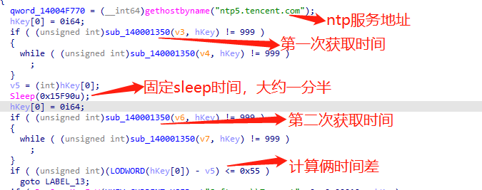 1.样本访问腾讯的ntp服务ntp5.tencent.com。获取第一次时间,随后sleep固定时间。再次访问ntp服务。计算两次时间的差值,判断是否符合预设值。