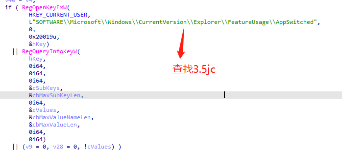 3.样本根据注册表查找系统使用的程序,会寻找是否存在3.5jc这个进程。如果没有就不会执行之后动作。![]()