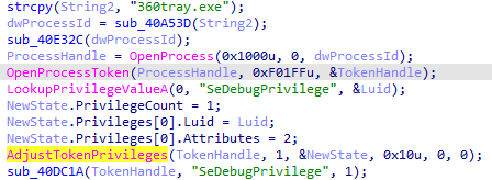 1.样本尝试访问360进程,并尝试对其设置访问令牌。![]()