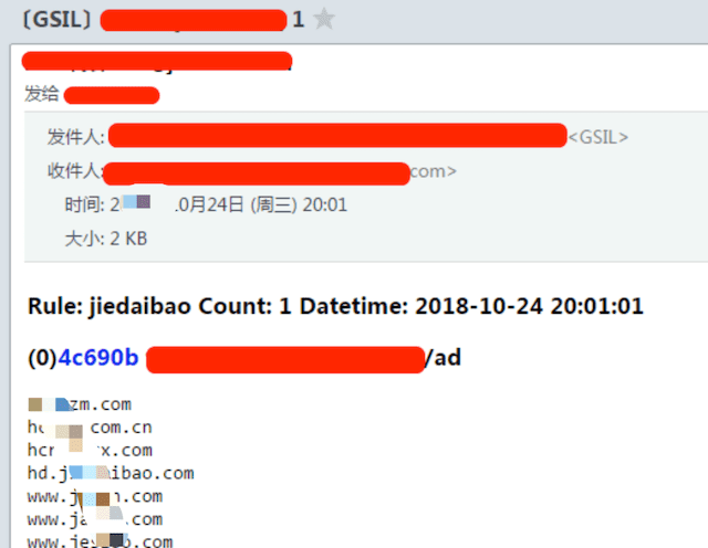 $ crontab -e# 漏洞报告,此项任务发现漏洞后会立刻发送漏洞报告# 每个小时运行一次,GitHub API接口调用频率限制可以根据token数量、规则数量来调整crontab频率实现,若觉得麻烦可简单配置多个token来实现。# crontab执行时间决定了报告的发送时效性,间隔越短报告越快但频率限制越容易触发# 建议配置5个token+20条规则,每15分钟运行一次(可以配置更短,根据各自需求确定)*/15 * * * * /usr/bin/python /var/app/gsil/gsil.py test > /tmp/gsil# 统计报告,发送一天的扫描进展,包括运行次数、成功次数、失败次数、发现漏洞数、各域名状况、异常等等# 每天晚上11点发送统计报告0 23 * * * /usr/bin/python /var/app/gsil/gsil.py --report
