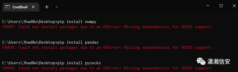 ERROR: Could not install packages due to an OSError: Missing dependencies for SOCKS support.解决方案: