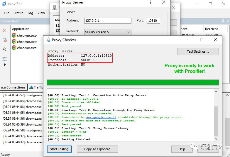 接着我们在Proxifier中添加一个socks/http代理,Profile->Proxy Servers->Add,输入127.0.0.1:10810即可,代理规则自行设置,先检查下是否已连通?