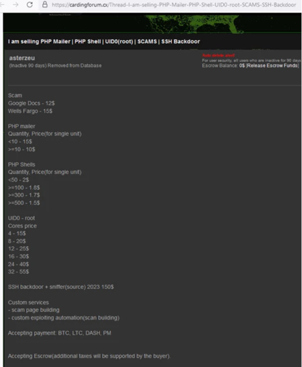 图6. 用户“asterzeu”在黑客论坛出售恶意工具的帖子