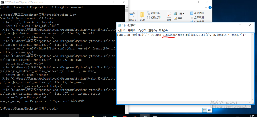 将函数添加运行后显示报错,提示缺少对象,说明它里面还调用了其他函数,继续搜索添加到1.js中运行1.py