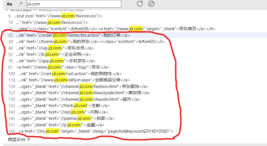 那京东网站为例,假如网站上的所有功能点都测完了,但是发现没有漏洞,在你毫无头绪的时候可以打开控制台CTRL shift + f 全局搜索一下,可以看到有很多网站的更多路径,我们可以继续顺着这个路径尝试找到它的其他漏洞。