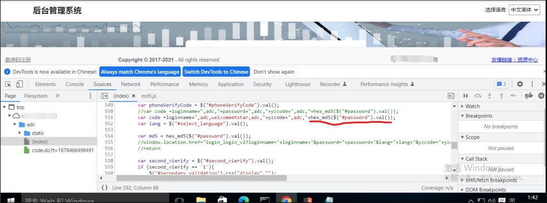 分析js代码后发现我们输入的密码被hex_md5函数进行加密,接着我们寻找这个加密函数