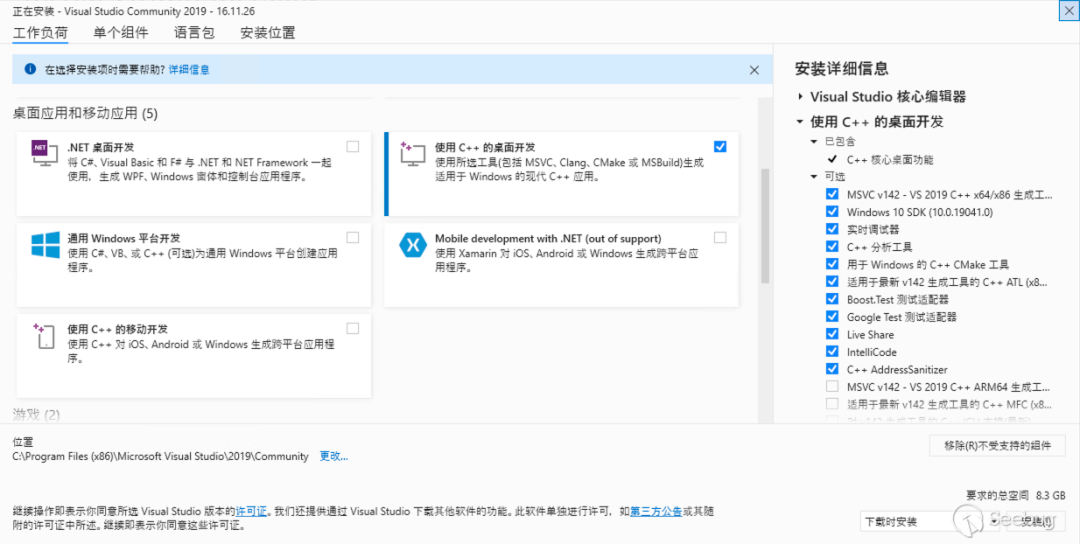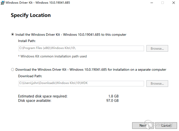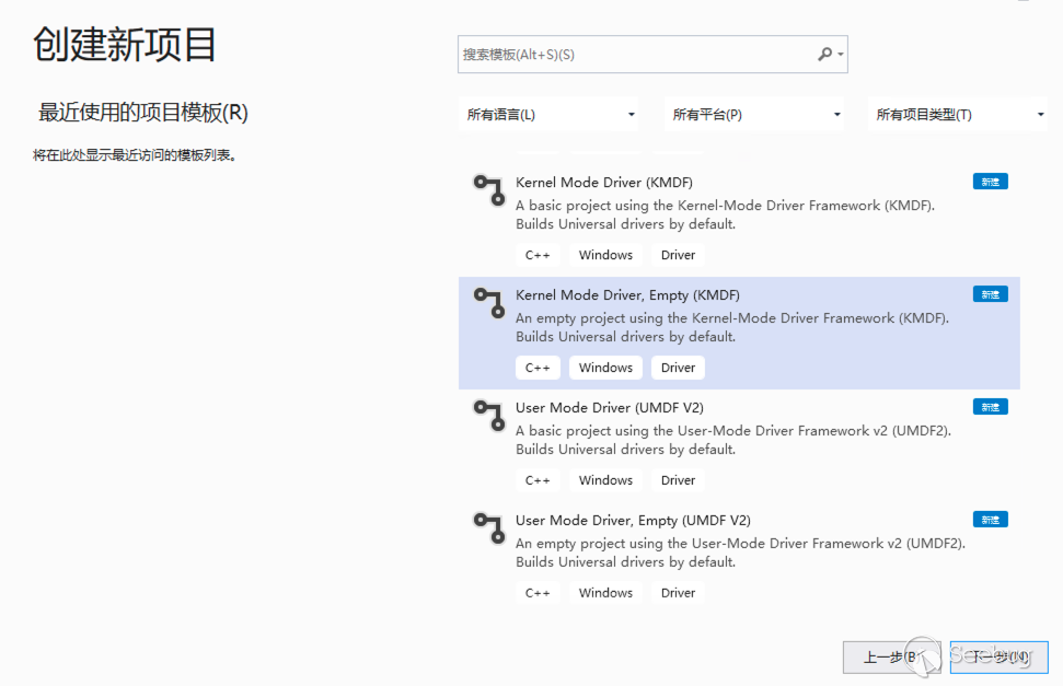 Visual Studio 2019 的 C/C 开发环境(https://visualstudio.microsoft.com/),按 Visual Studio 官方教程,自动下载安装「使用C的桌面开发」,其中 SDK 默认为 10.0.19041.0:Visual Studio 安装 WDK 扩展插件,按照指导进行安装即可,随后我们可以在 Visual Studio 的创建项目页面,就看到 KMDF/UMDF 等选项,表示 windows 驱动开发环境配置成功。0x02 HelloWorld开发