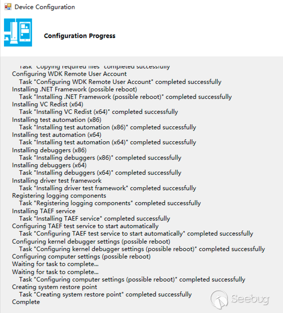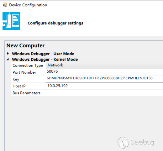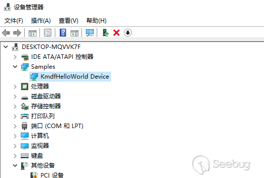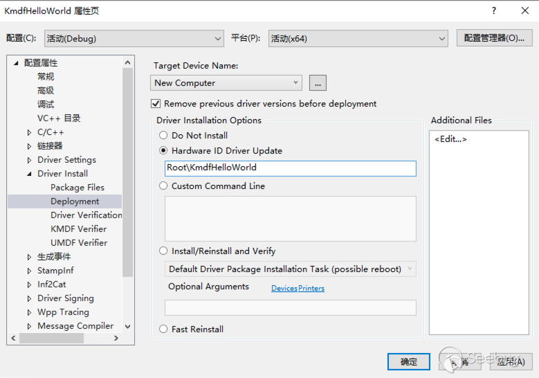 debugee),驱动程序将在被调试机上(debugee)进行部署和测试,而本台主机即作为开发主机同时作为调试机(debugger),如下:debugee)上也安装上 WDK 环境,随后在 WDK 的安装目录下运行该工具 WDK Test Target Setup,默认路径:C:\Program Files (x86)\Windows Kits\10\Remote\x64\WDK Test Target Setup x64-x64_en-us.msi;在之后调试机(debugger)中的 Visual Studio 将连接被调试机(debugee)的 WDK Test Target Setup 的工具,自动完成双机调试环境的配置。debugger)初始化被调试机的相关信息,在 项目属性-Driver Install-Deployment 中添加新设备,我们这里使用网络双机调试的方式,默认参数即可:Visual Studio 中将被调试机(debugee)添加完毕后,在如下窗口选择该主机并设置驱动的硬件 ID 为 Root\KmdfHelloWorld,如下:Visual Studio 菜单中 生成-部署解决方案,驱动程序将自动部署在被调试机上(debugee)并进行测试运行:debugee)上我们在设备管理器中可以看到 KmdfHelloWorld 已经成功部署了:0x04 本机调试驱动程序