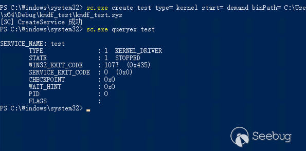 sc.exe create test type= kernel start= demand binPath= C:\Users\john\Desktop\workspace\kmdf_test\x64\Debug\kmdf_test\kmdf_test.sys# 使用 queryex 查看创建的服务信息