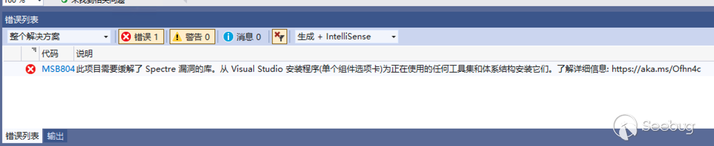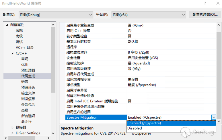 Visual Studio 默认开启了缓解 Spectre 攻击的机制,可在 VS 安装器中选择安装指定的支持库,我们实验环境下可以直接关闭该功能,在 项目属性-C/C++-代码生成-Spectre Mitigation 设置为 Disable: