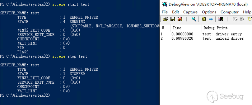 sc.exe 命令启动驱动程序运行,并使用 DebugView 查看调试输出(需要勾选 Capture Kernel 和 Enable Verbose Kernel Output 才能看到输出):# 启动运行驱动程序