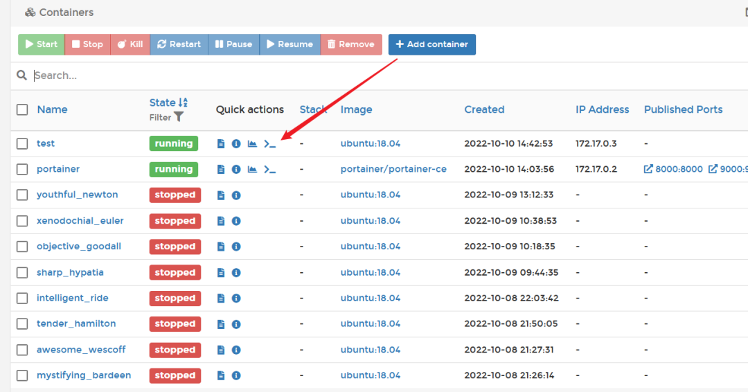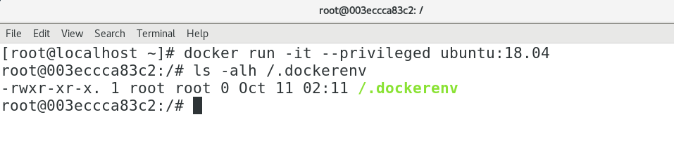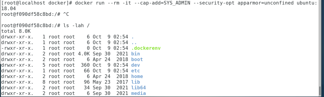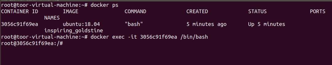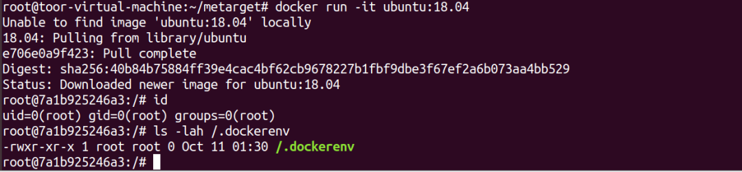 在安装有docker机器的主机上直接运行该命令,启动该容器即可。docker run -it --privileged ubuntu:18.04