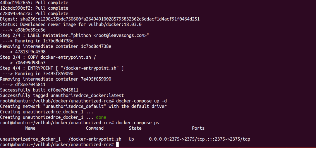 在vulhub中存在该漏洞复现环境,部署命令如下:cd docker/unauthorized-rce/