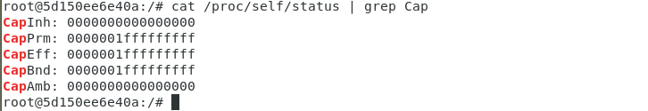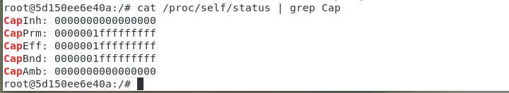 在启动后我们会进入到docker容器的bash中,在这里我们查看当前主机的docker是否为特权模式启动。cat /proc/self/status | grep Cap