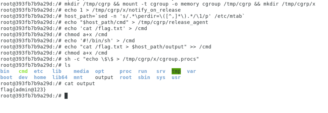 sh -c "echo \$\$ > /tmp/cgrp/x/cgroup.procs" 如上图所示,成功获取到宿主机根目录的flag.txt的内容,同理,我们将上面poc中的echo中的命令修改为反弹shell的命令,即可进行反弹shell,获得宿主机的权限。