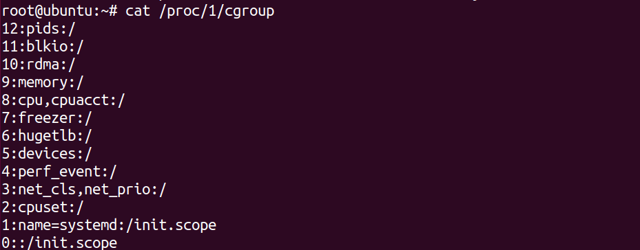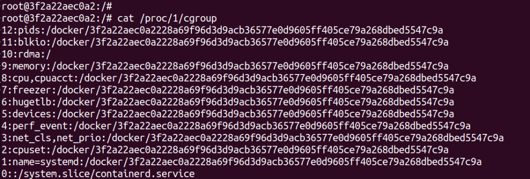 2. 查询系统进程的cgroup信息,docker环境中的cgroup文件普遍存在docker字段,而真实环境中不存在docker字段cat /proc/1/cgroup