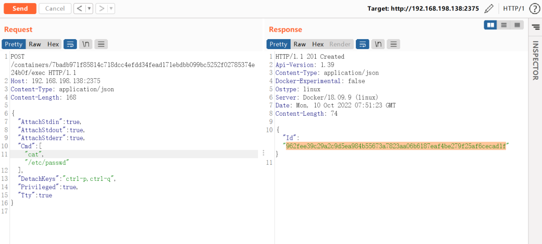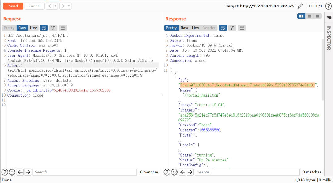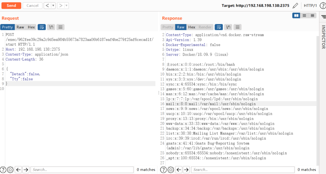 访问 http://192.168.198.129:2375/containers/json 获得刚刚返回的exec_id的参数,构造如下数据包: