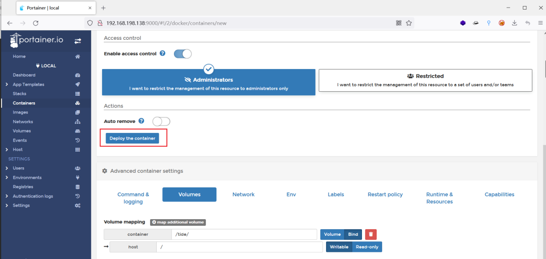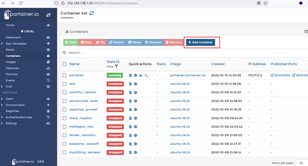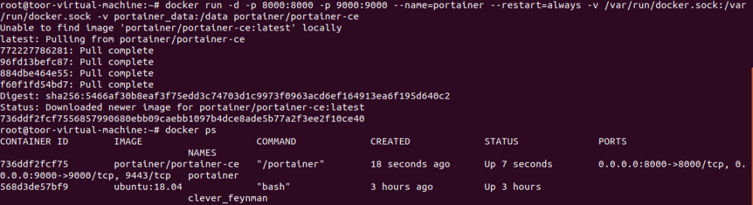 在安装了docker的物理机中运行该命令docker run -d -p 8000:8000 -p 9000:9000 --name=portainer --restart=always -v /var/run/docker.sock:/var/run/docker.sock -v portainer_data:/data portainer/portainer-ce