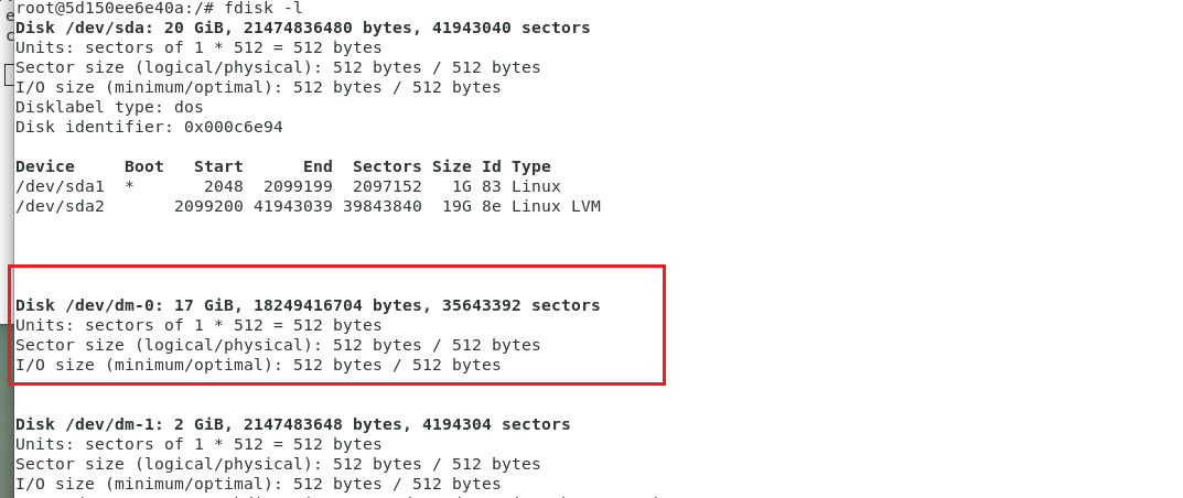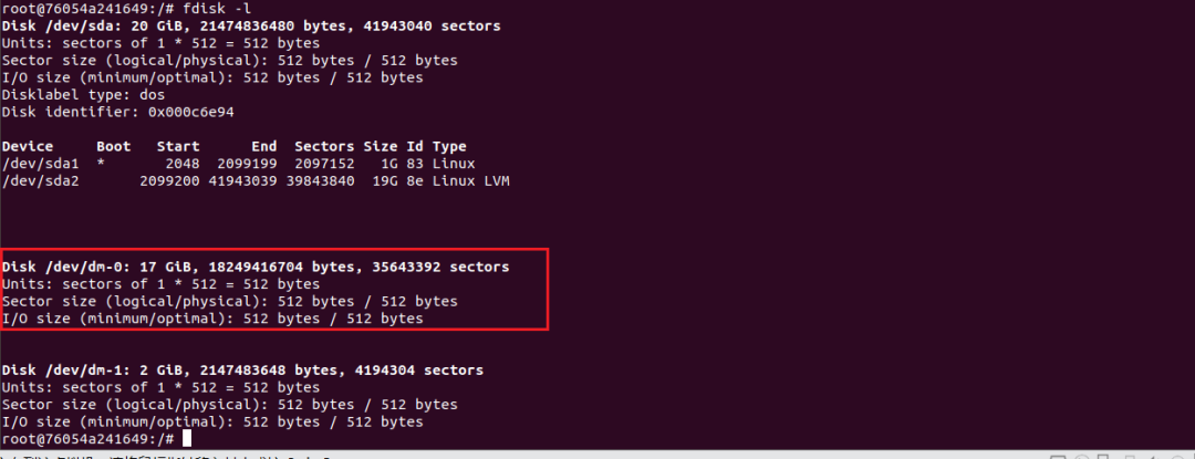 进入容器后,使用fdisk -l命令查看磁盘文件fdisk -l