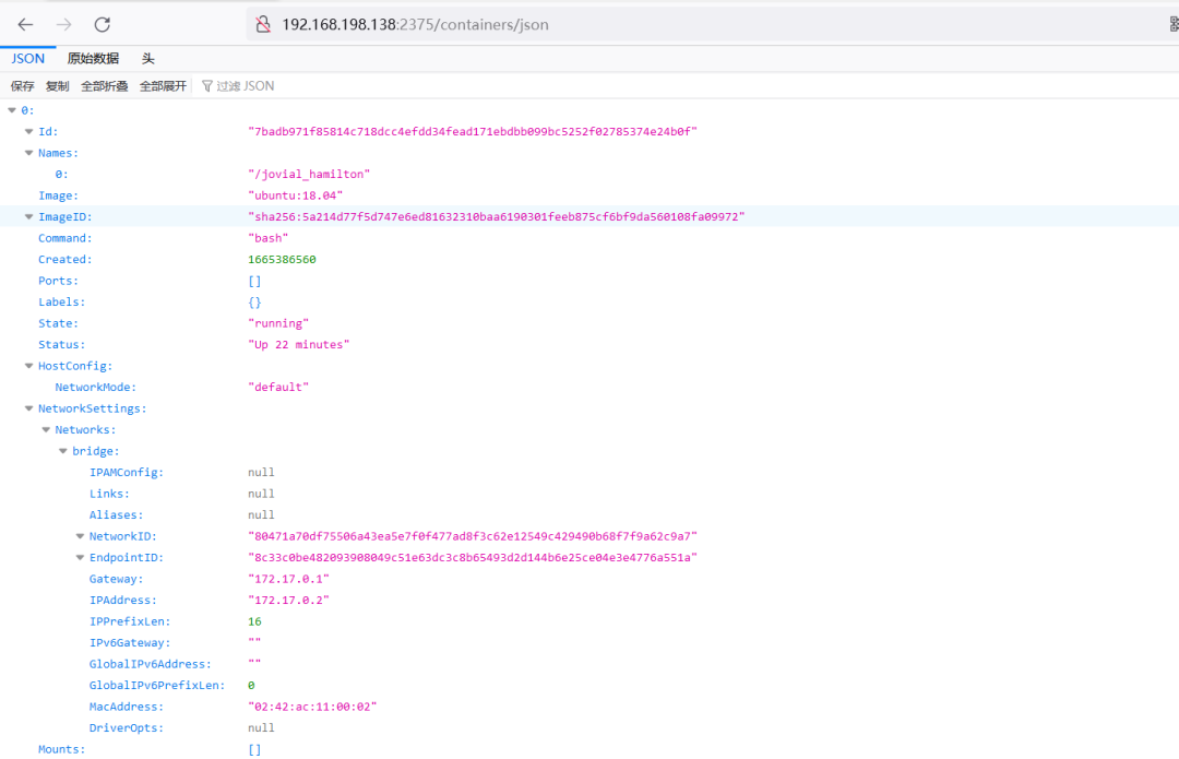 比如访问 http://192.168.198.129:2375/containers/json 会返回docker信息,和在docker CLI上执行 docker ps 的效果一样,其他操作比如创建/删除container,拉取image等操作也都可以通过API调用完成。