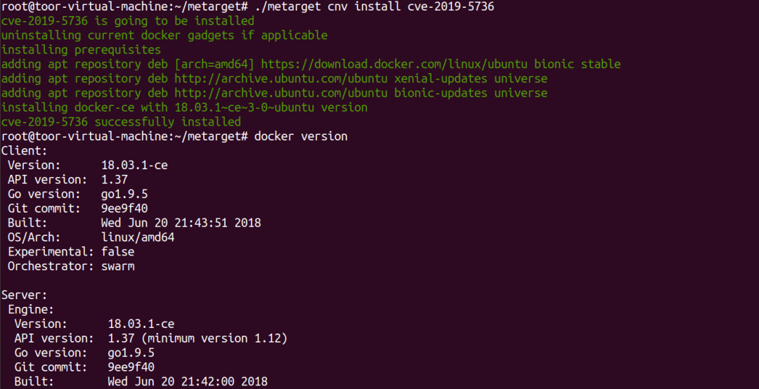 ./metarget cnv install cve-2019-5736如上,已成功搭建好符合版本的docker环境,接下来我们启动一个docker容器即可