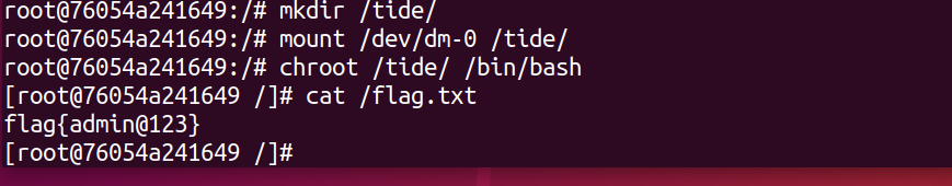 分区大小得知到宿主机的磁盘为/dev/dm-0,这里可以使用上面我们刚刚特权模式逃逸的命令将该磁盘挂载到目录中mkdir /tide/