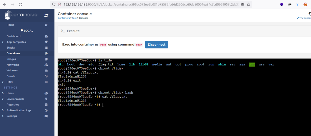 这时可以看到返回出一个bash会话,这里我们就可以看到我们之前在宿主机中创建的flag.txt了