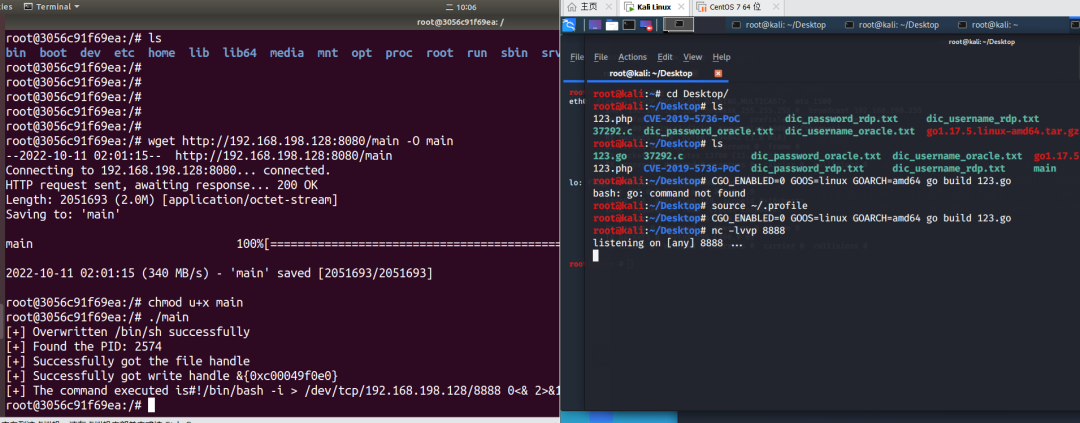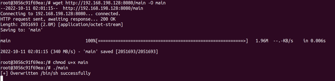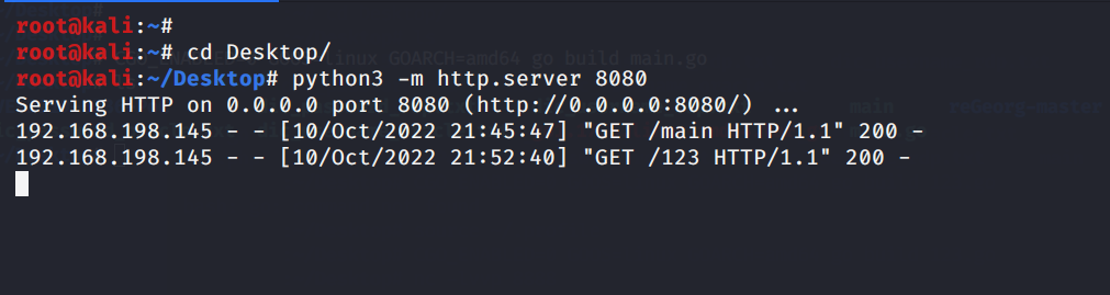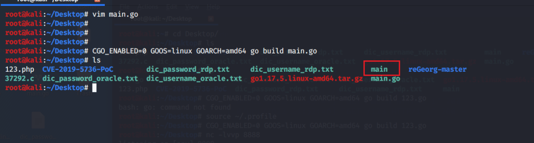 CGO_ENABLED=0 GOOS=linux GOARCH=amd64 go build main.go 编译后会生成一个main的可执行文件,这里我们需要将其放到docker容器中,在kali中启动一个http服务,在容器中使用wget的命令去下载该文件