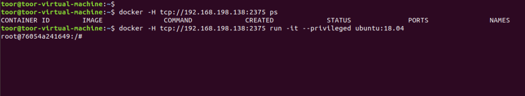 因为docker 有远程连接命令,由于2375端口暴露,可未授权访问,所以现在可以在我们的主机上通过远程方式连接doker ,然后以特权模式启动一个docker容器,从而达到逃逸到宿主机的情况docker -H tcp://192.168.198.138:2375 ps