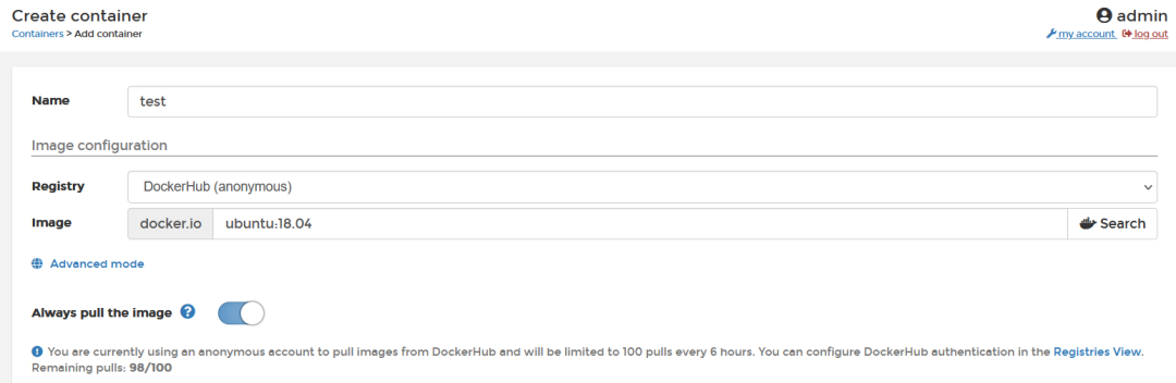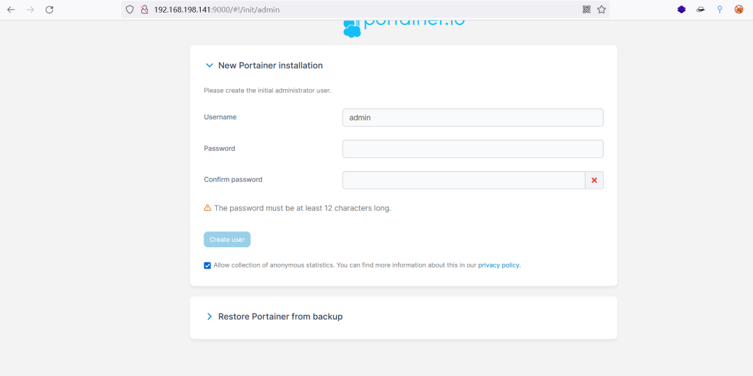 部署成功后访问宿主机的9000端口,设置用户名与密码