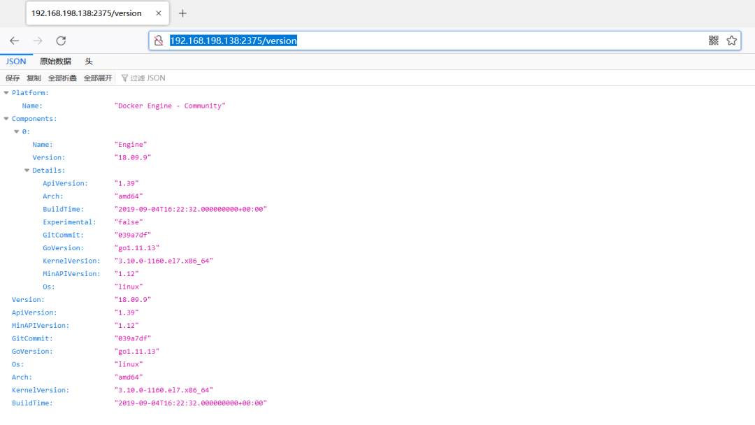 这里如果我们继续访问http://192.168.198.129:2375/version,会返回docker的版本信息,这样证明该漏洞存在。