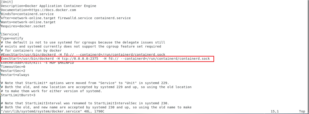 开启2375端口,提供外部访问:vim /usr/lib/systemd/system/docker.service