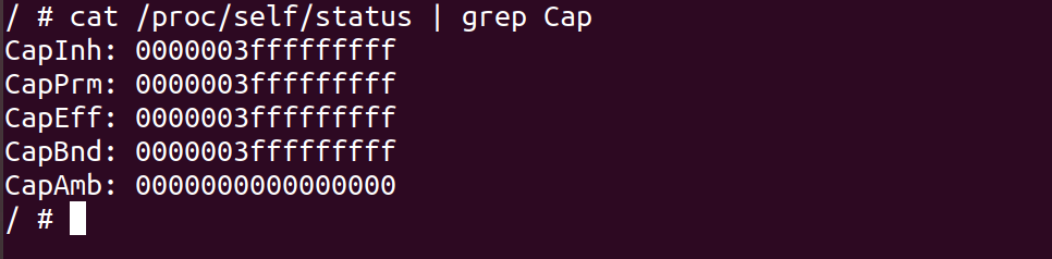 在容器中可以使用该命令检测当前容器是否以特权模式启动cat /proc/self/status | grep Cap如果是特权模式启动的话,CapEff对应的掩码值在centos中为 0000001fffffffff ,在ubuntu中为0000003fffffffff,如下图