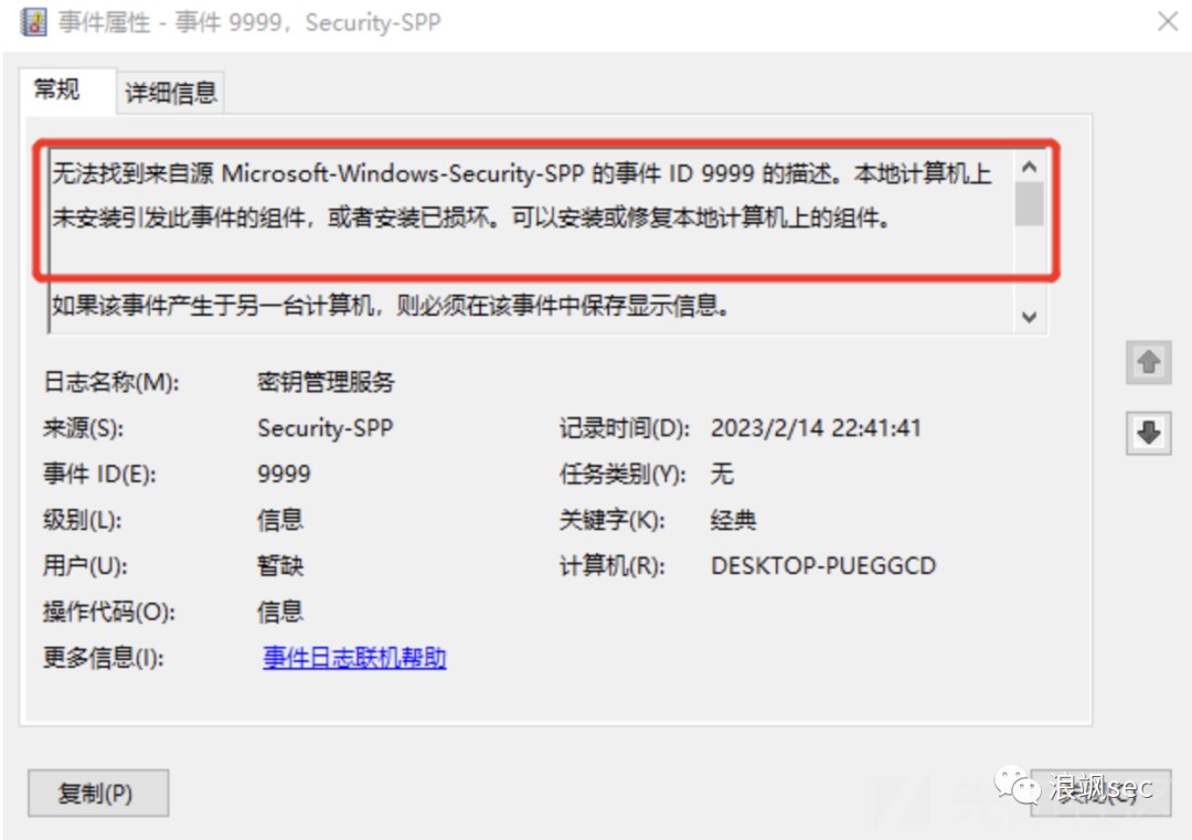 在HKEY_LOCAL_MACHINE\SYSTEM\CurrentControlSet\Services\EventLog\对应的日志名称下的条目中,存在一个EventMessageFile属性。如果在注入载荷的时候,事件ID不存在于该属性指定的源关联的事件消息文件中,则会出现下图这个日志消息:
