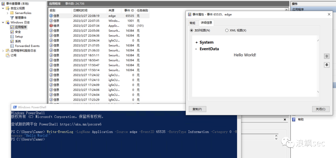 在事件查看器中,可以看到事件ID为65535的日志成功创建在应用程序日志中,消息为Hello World!