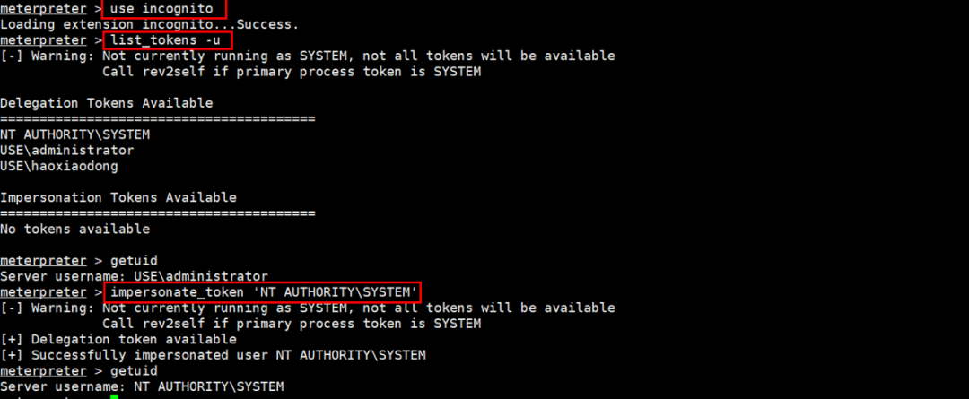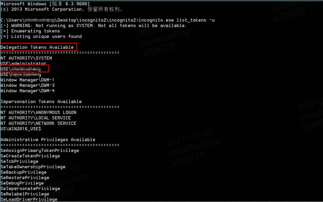 想列举令牌只能列出当前用户和比当前用户权限更低用户的令牌,例如当前权限是system或者是administrator,那么我们就可以看到系统中所有的令牌,如使用其他用户登录后注销再用administrator用户登录,通过incognito.exe工具能够获取到已注销用户的token:
