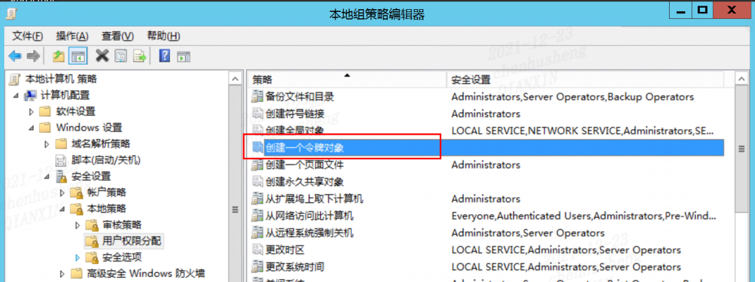1) 创建令牌对象的权限设置,通过GPO策略:计算机配置 > Windows 设置 > 安全设置 > 本地策略 > 用户权限分配:创建令牌对象。