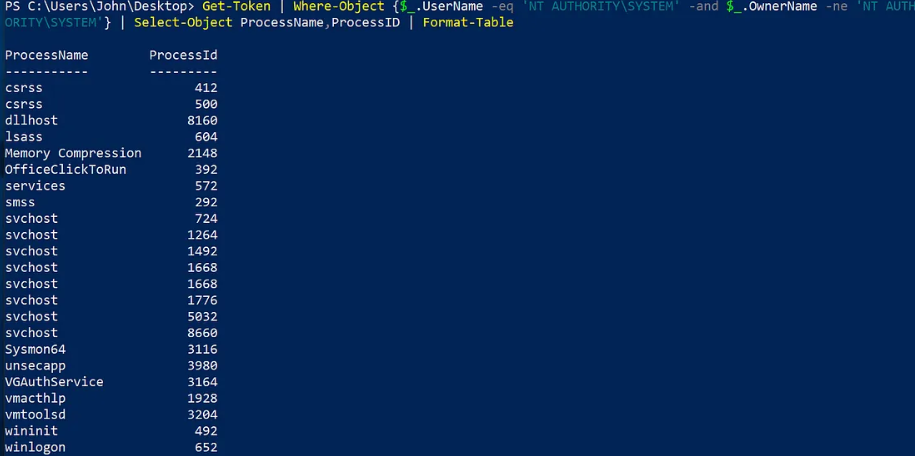 Where-Object {$.UserName -eq 'NT AUTHORITY\SYSTEM' -and $.OwnerName -ne 'NT AUTHORITY\SYSTEM'} | Select-Object ProcessName,ProcessID | Format-Table