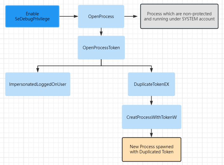 4)使用 CreateProcessWithTokenW(),通过DuplicateTokenEx()创建的访问令牌可以传递给CreateProcessWithTokenW(),从而使用复制的令牌生成一个新的进程。