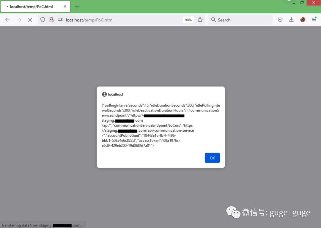 攻击者在自己的服务器上托管上述代码,经过身份验证的用户如果访问页面的URL,可以看到成功获得用户的AccessToken和UID值: