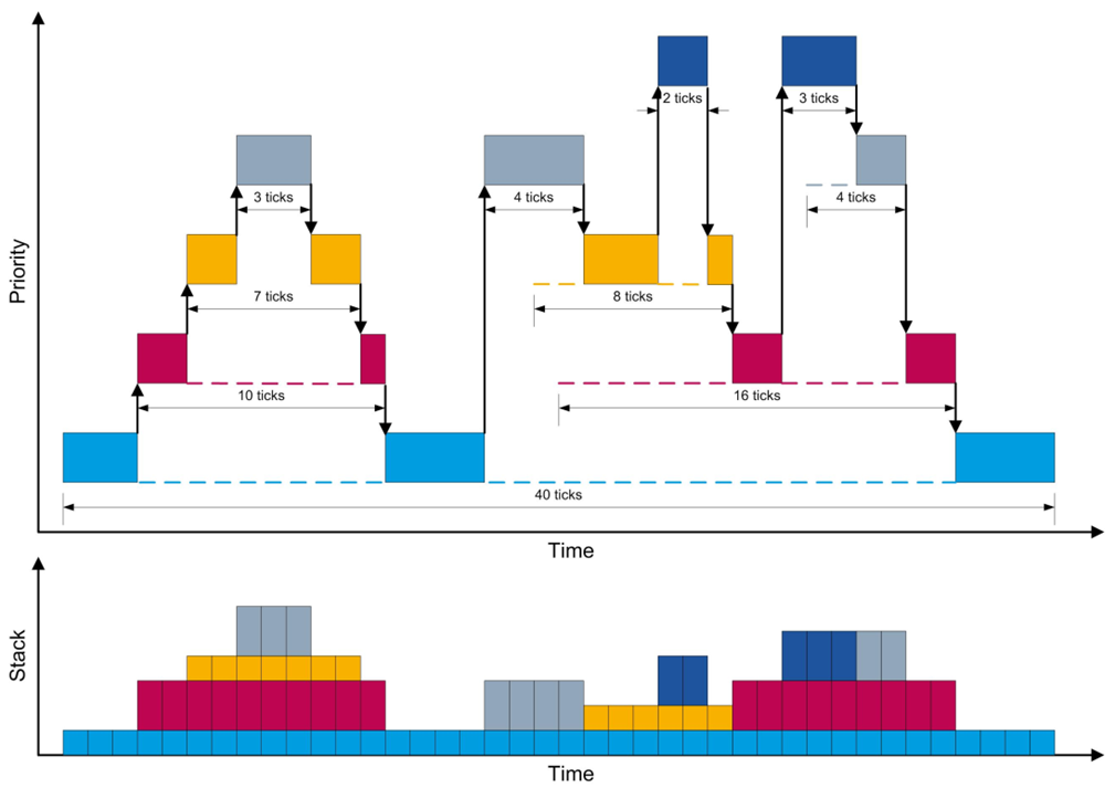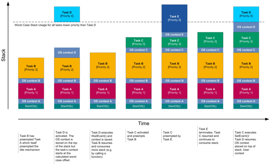 这里操作系统会根据静态配置的任务使用的栈,进行预留。换句话说就是配置完扩展任务后,os 根据优先级比扩展任务优先级高的任务使用栈的最大总和,预留一下。把扩展任务的栈至于栈底 + 最大使用量。当扩展任务到running状态后,直接就在规定的栈地方运行。所以这里很考验前面的所有task的栈,如果是使用超了,这时候程序必然就崩了。