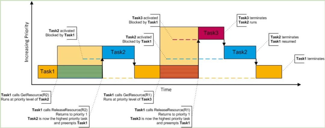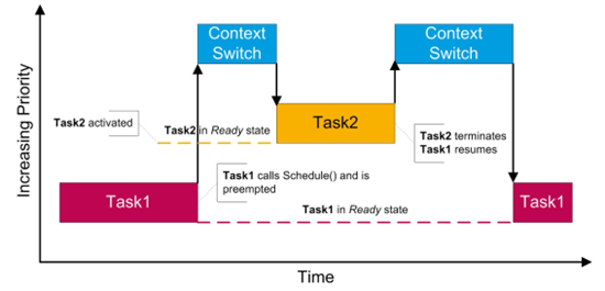 #include <Os.h>TASK(Write){/* Highest priority .*/WriteBuffer();GetResource(Guard);BufferNotEmpty = True;ReleaseResource(Guard);ChainTask(Read);}TASK(Read){/* Lowest priority. */ReadBuffer();GetResource(Guard);if( BufferNotEmpty ) {ReleaseResource(Guard);ChainTask(Read);} else {ReleaseResource(Guard);TerminateTask();}}