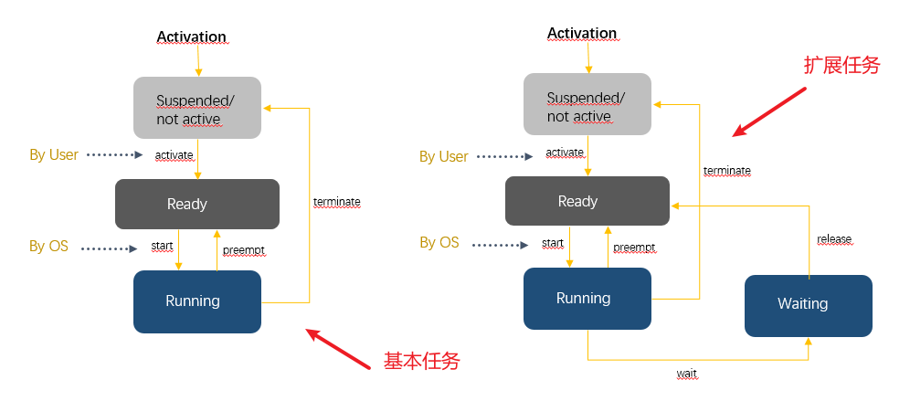 其主要的区别就是有无waiting状态。这里先表示一下基本状态,下面对其使用栈详细描述可以按需在实际架构中设计,使用。