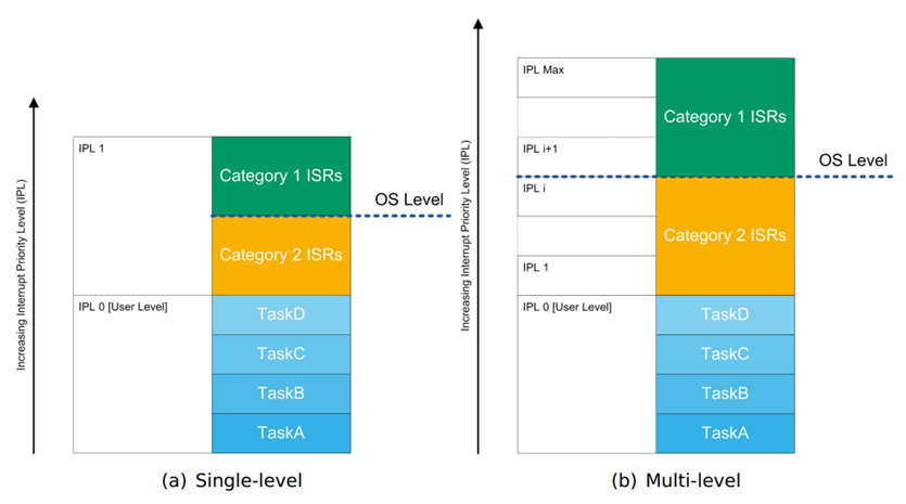 下图可以看出来一类中断时独立于os的,高于os的。根据不同的芯片是不同的,有的芯片的中断优先级是组类别,有的是独立的。也就是说中断是否可以嵌套。