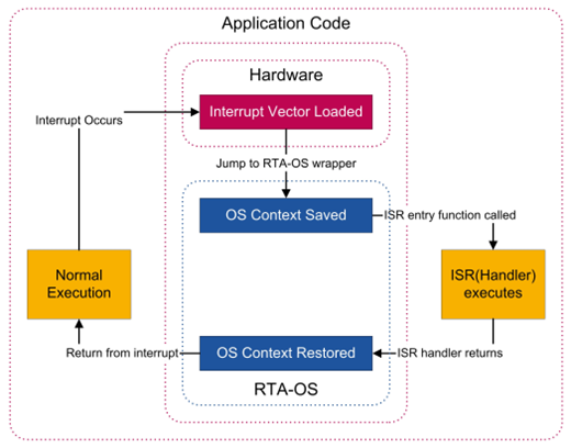 #include <Os.h>ISR(InefficientHandler) {/* Long handler code. */}#include <Os.h>ISR(EfficientHandler) {ActivateTask(Task1);}TASK(Task1) {/* Long handler code. */TerminateTask();}#include <Os.h>ISR(Interrupt1) {/* Dismiss the interrupt where required *//* Rest of the handler */}